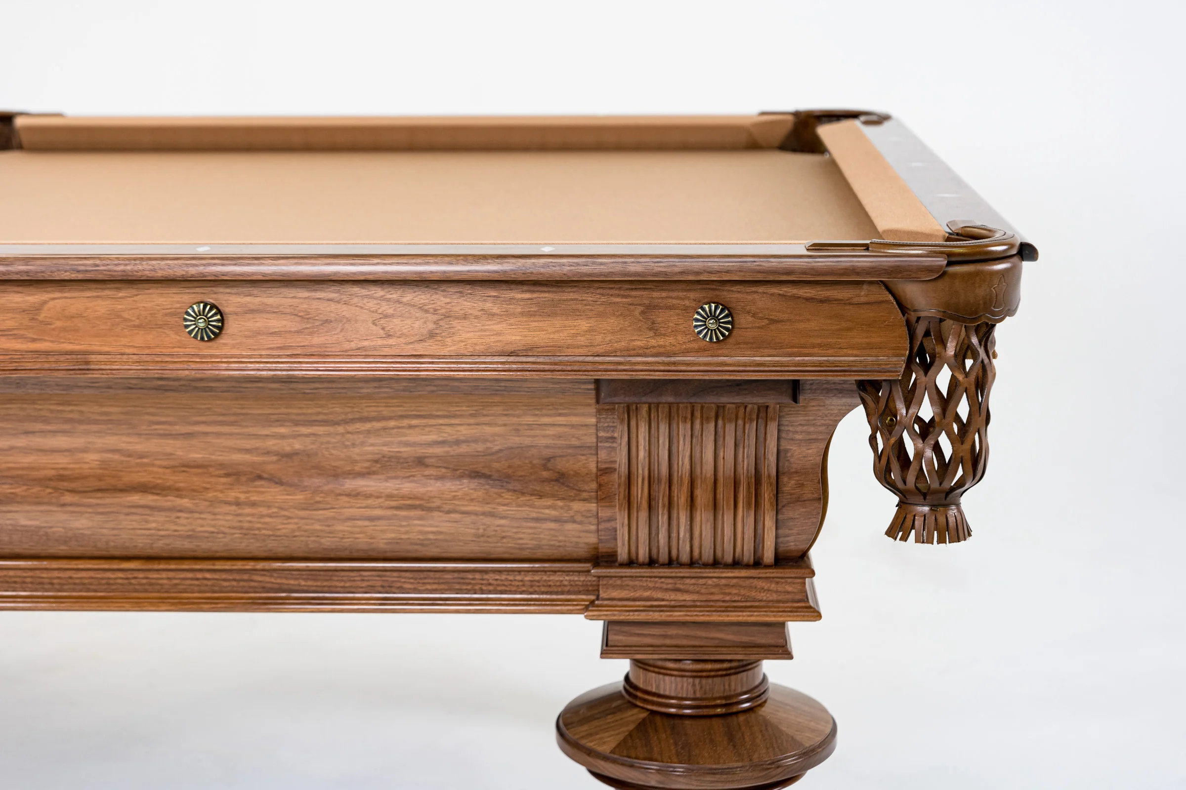 S-Shaped frame with fluted corner plaques. Hand turned legs featuring flitch matched veneers. Elegant trims and moldings throughout the entire design.