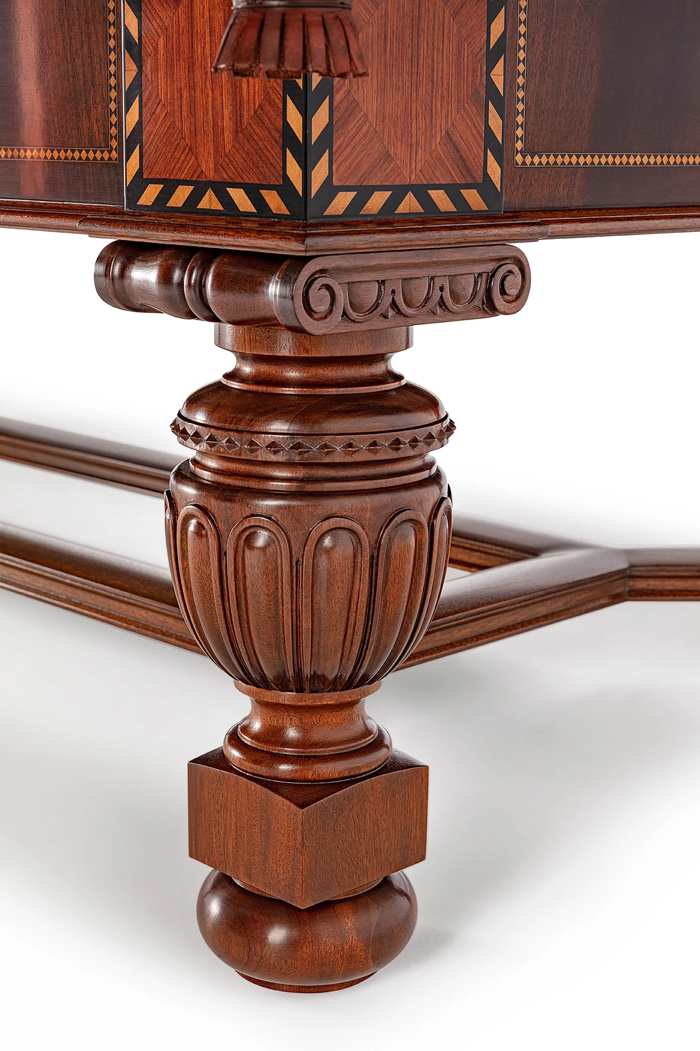 Elegant, and bold. Features a unique leg stretcher, and exotic patterned inlays around the corner blocks and aprons.