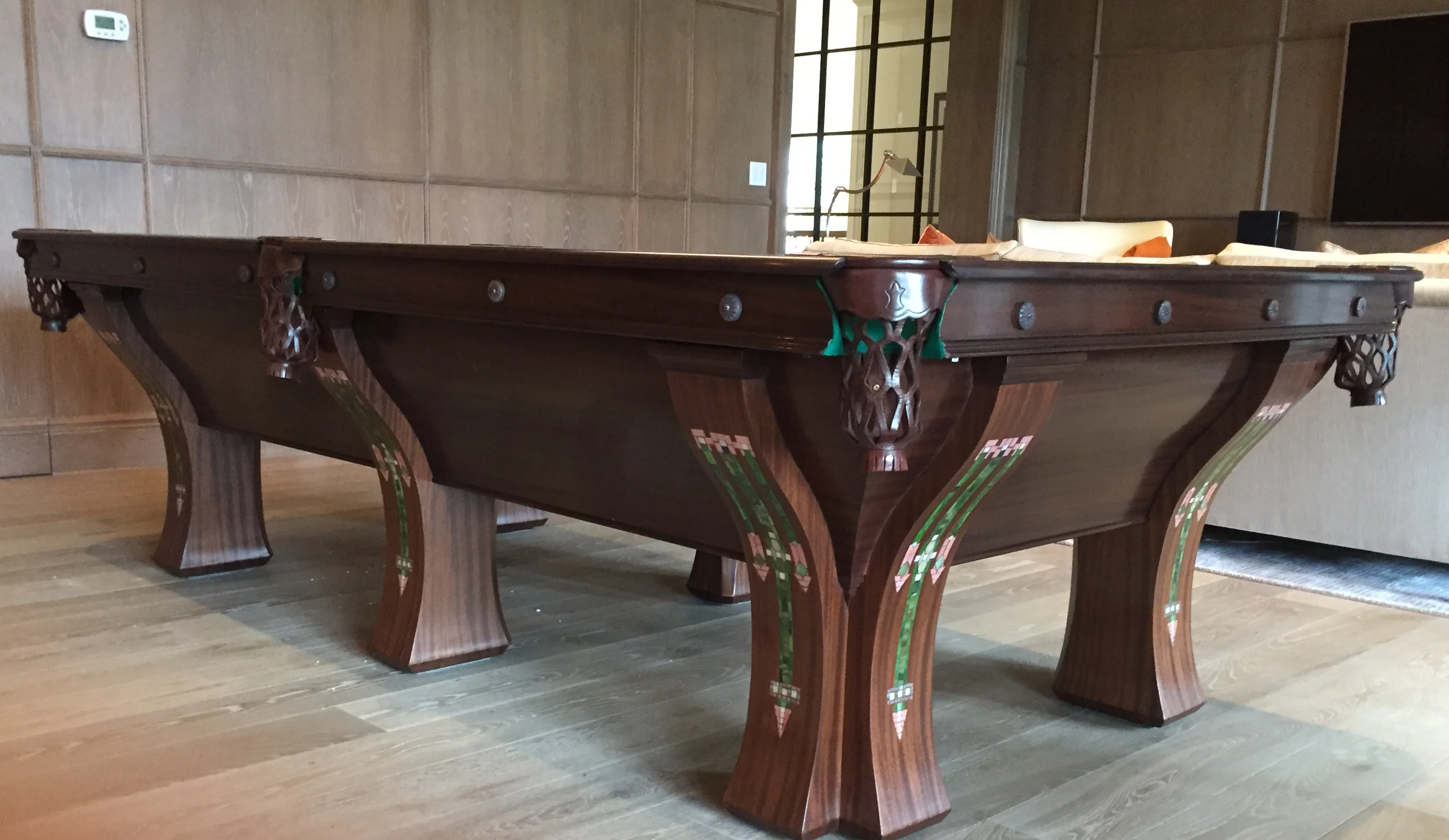 A custom Blatt Billiards interpretation of a classic Brunswick original model. Available Fully Custom or Antique Restored. Available With Or Without Glass Inlaid Artwork.