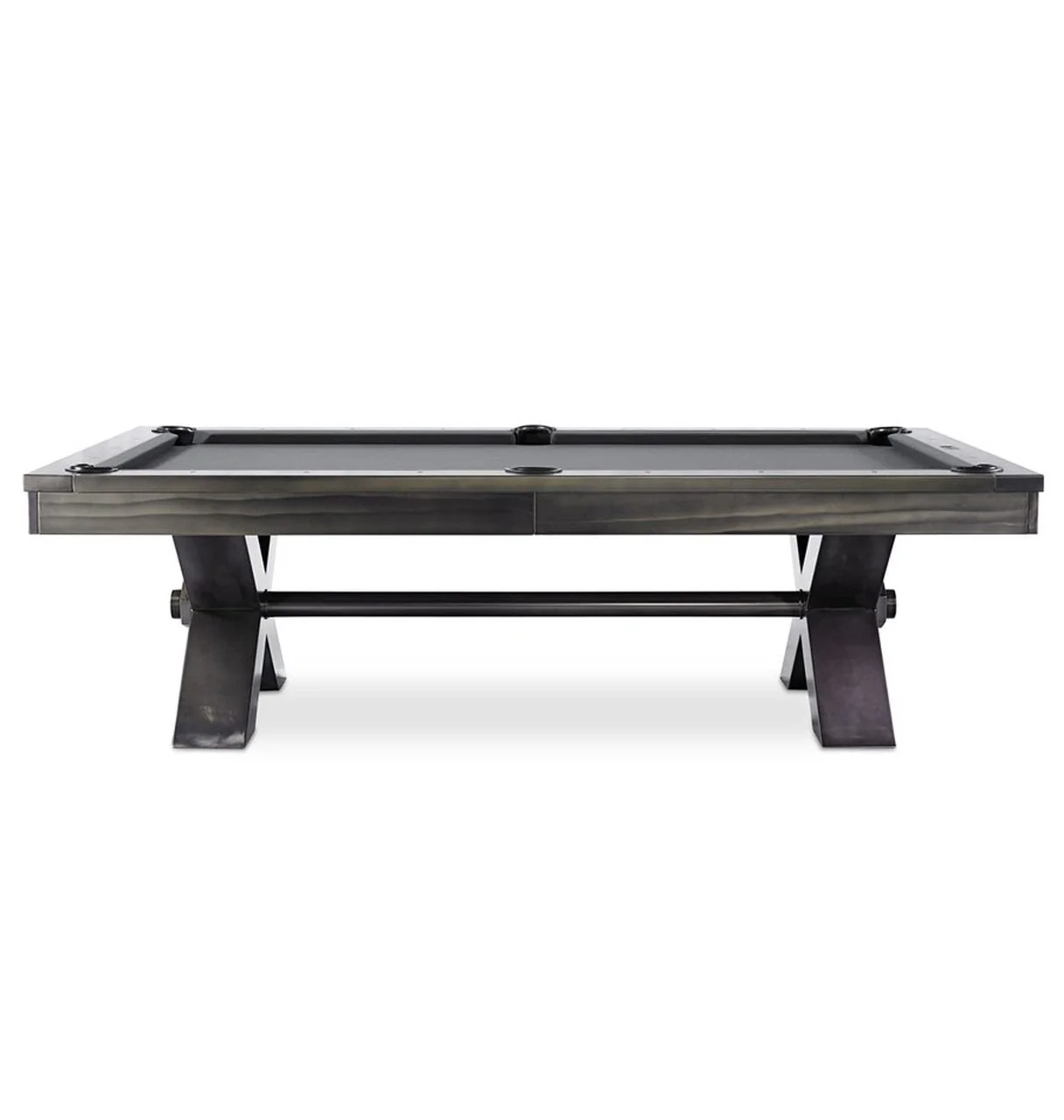 This industrial modern pool table features a unique solid steel sub frame and legs, a scratch resistant heavy duty finish and 100% leather black bucket pockets.